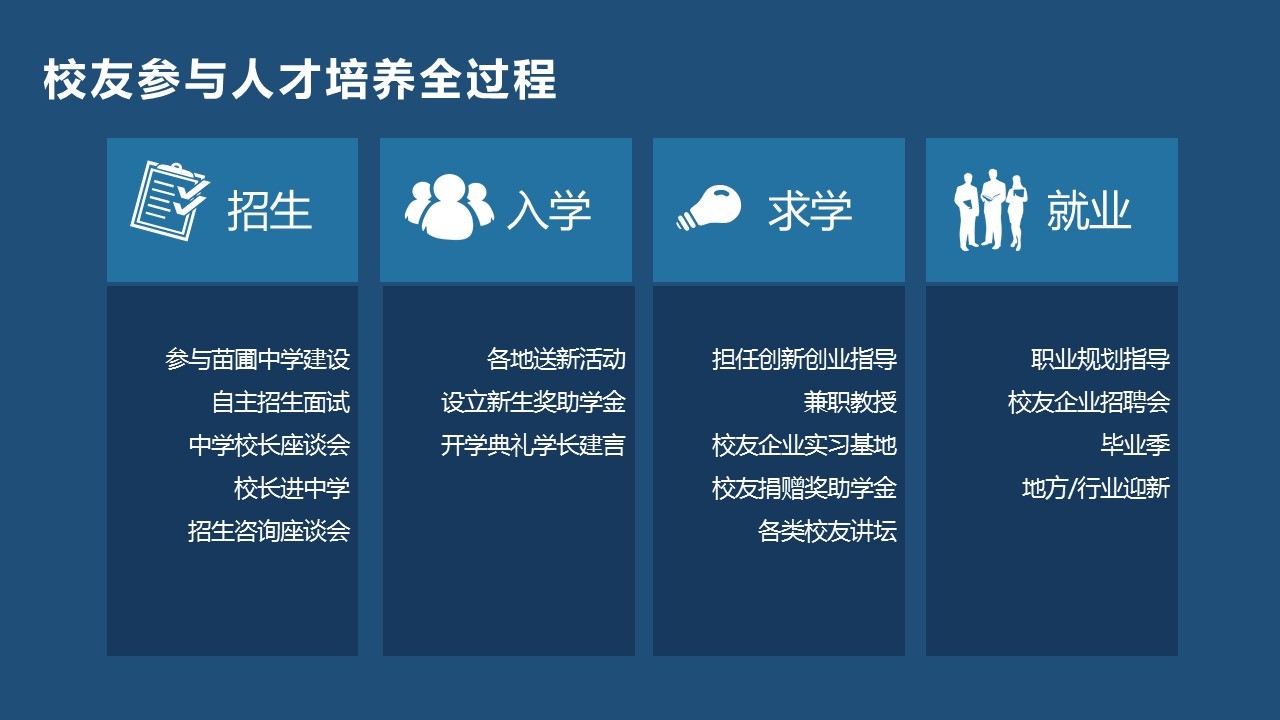 ,通过校友会平台,越来越多的校友参与了“选送育迎”的人才培养全过程。从招生(参与“苗圃中学”建设、自主招生面试等)、入学(送新生、设立新生奖助学奖等)、求学(担任创新创业指导兼职教授、校友企业实习基地、校友捐赠奖助学金、分享职业和专业经验等)、就业(职业规划指导、校友企业招聘会、毕业季活动、地方
