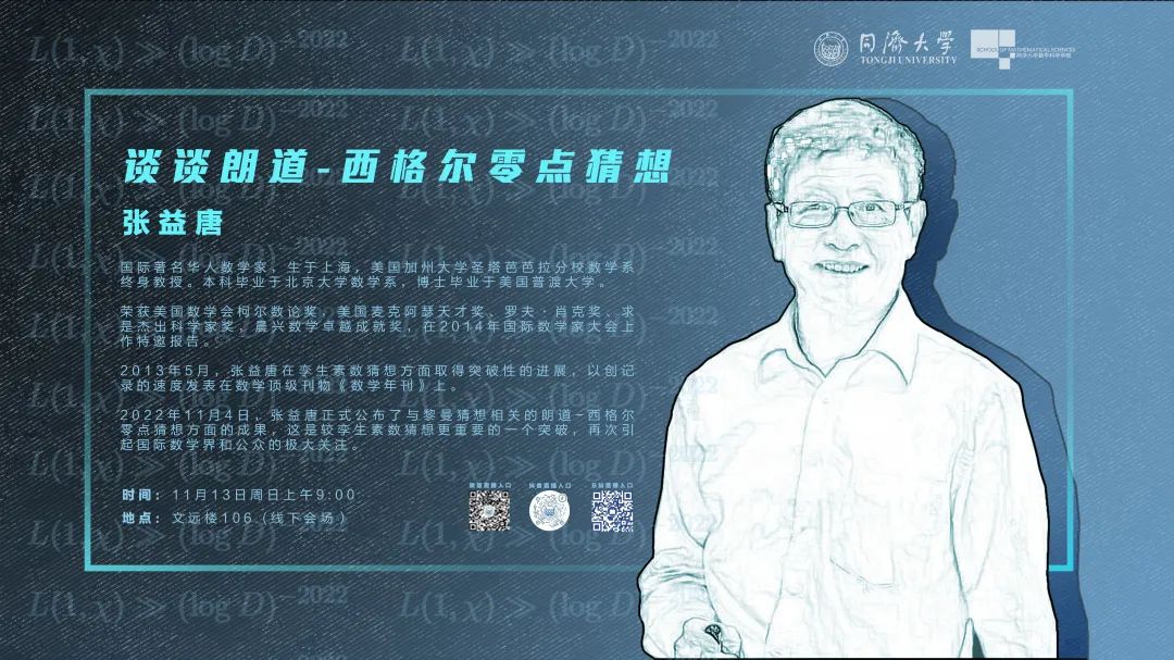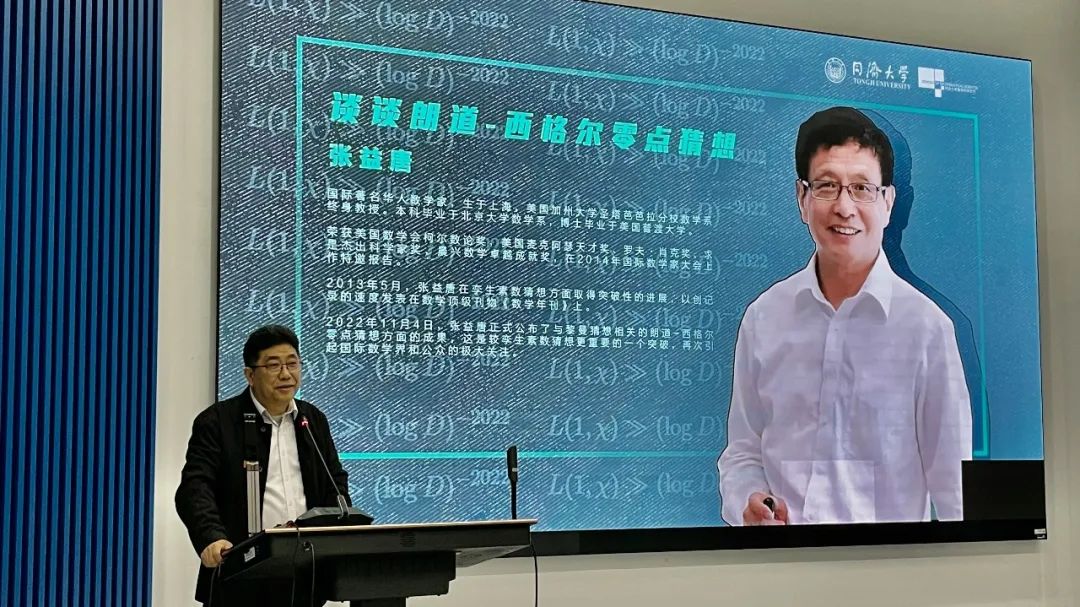 11月13日上午,国际著名华人数学家、美国加利福尼亚大学圣巴巴拉分校教授张益唐以在线视频方式向同济师生作学术报告,分享他关于朗道-西格尔零点猜想的最新研究发现。常务副校长吕培明、数学科学学院相关负责人及教师代表出席活动。来自数学科学学院、国豪书院、新生院数学拔尖班等150名学生参与线下会场,报告同步在同济大学视频号、抖音号、B站号直播,累计观看人数达12万。