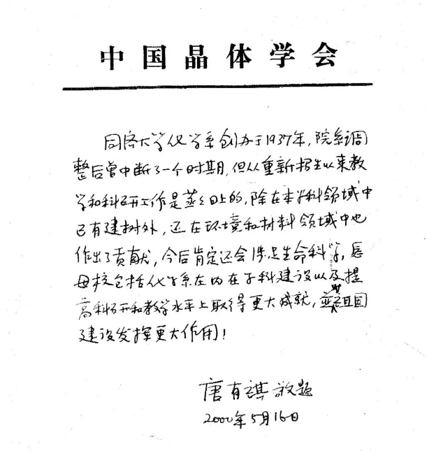 同济化学恢复建系以来,一直得到唐有祺校友的关心、支持、指导和帮助。特别值得一提的是,2000年5月,唐有祺校友曾亲笔题写一段文字,对母校化学学科发展予以勉励、寄予厚望:同济大学化学系创办于1937年,院系调整后曾中断了一个时期,但从重新招生以来教学和科研工作是蒸蒸日上的,除在本学科领域中已有建树外,还在环境和材料领域中也作出了贡献,今后肯定还会涉足生命科学。愿母校包括化学系在内在学科建设以及提高科研和教学水平上取得更大成就,并对祖国建设发挥更大作用!