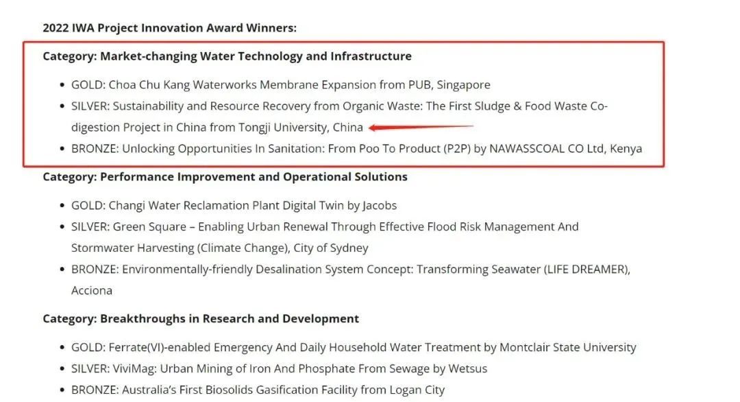 在近日于丹麦哥本哈根举行的2022年国际水协会(International Water Association,IWA)世界水大会暨展览会上,IWA项目创新奖(Project Innovation Awards,PIA)颁授,由同济大学环境科学与工程学院戴晓虎教授团队牵头,同济大学、上海市政工程设计研究总院、镇江市水业有限责任公司、上海同济普兰德生物质能股份有限公司、德国布伦瑞克工业大学联合完成的项目“基于协同厌氧消化的市政污泥与餐厨垃圾等有机废弃物可持续资源利用处理技术及模式”斩获国际银奖。此次项目创新奖设有6个类别,每个类别设金银铜奖各一名。全球共有18个项目获奖,中国有2个项目获银奖。