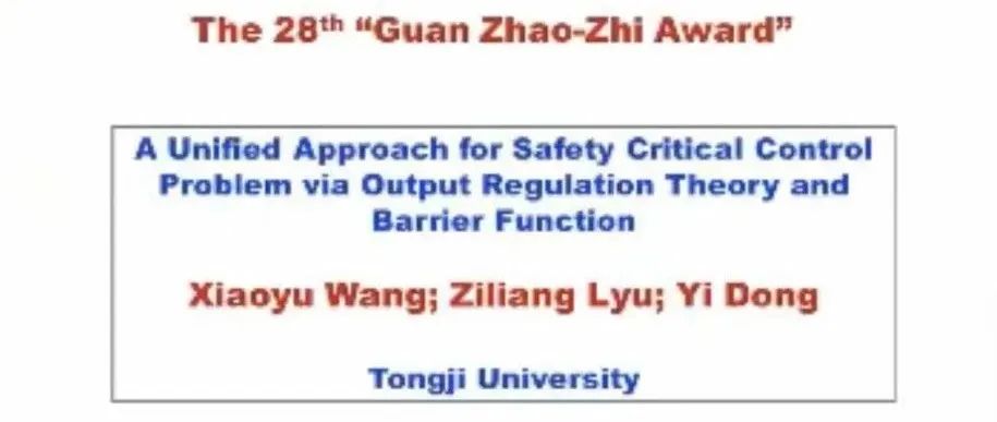 在7月27日闭幕的第41届中国控制会议(The 41th Chinese Control Conference, CCC2022)上,同济大学电子与信息工程学院控制科学与工程系博士研究生王肖宇、吕梓亮与导师董怡研究员合作的论文“A Unified Approach for Safety Critical Control Problem via Output Regulation Theory and Barrier Function”荣获第28届“关肇直奖”。“关肇直奖”每年从中国控制会议全世界所有投稿中选出1-2篇论文授奖,是目前我国控制理论界最高水平的青年学术奖项之一。这是首次由同济大学的在学研究生获得此奖项。