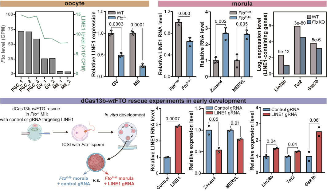 同济的研究团队利用自身在胚胎发育研究中的修饰,证明FTO蛋白缺失会影响卵母细胞的分化成熟,并且这种缺陷型的卵细胞在FTO蛋白完全缺失的情况下,将存在严重的着床与发育问题。团队成功证明FTO在卵母细胞发育和早期胚胎中参与LINE1 RNA的调控,并且同样会参与细胞核内染色质开放,LINE1下游靶标基因(包括2C基因和逆转座子),以及LINE1附近编码基因的转录活性调控。团队使用LINE1 RNA位点特异性m6A擦除系统,证明了LINE1 RNA丰度,核内染色质开发以及编码基因的异常确实由LINE1上的m6A修饰累积引发。