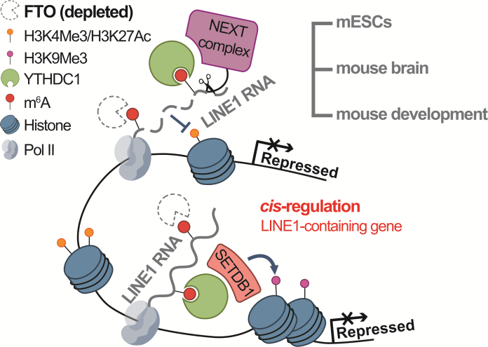图1. FTO调控LINE1 RNA表达和附近染色质状态以及对LINE1-containing基因表达的顺式调控