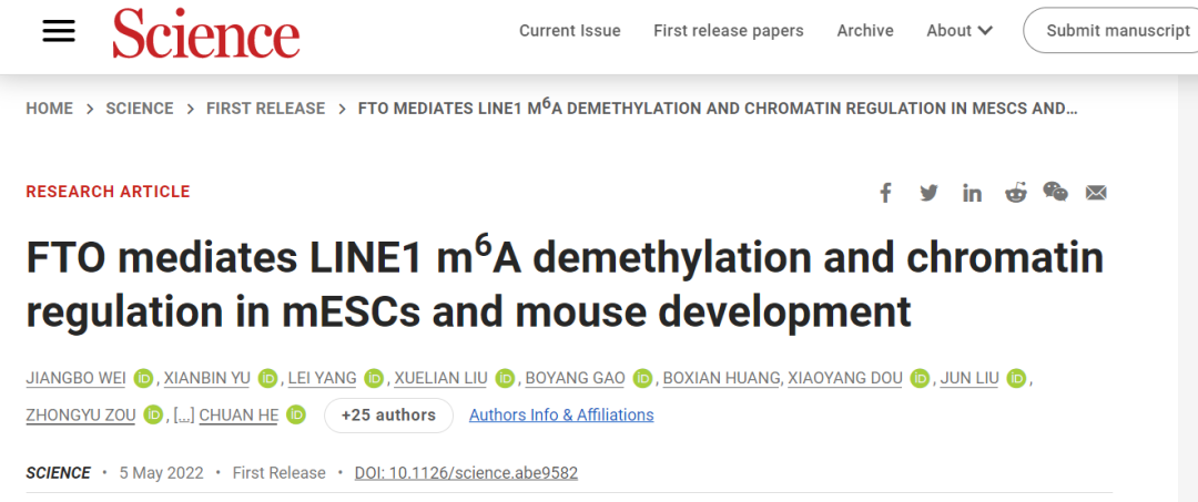 北京时间5月6日凌晨,同济大学生命科学与技术学院高绍荣/高亚威教授团队与美国芝加哥大学何川教授合作在《科学》(Science)上在线发表了题为《FTO在mESCs和小鼠发育中介导LINE1 m6A去甲基化和染色质调节》(FTO mediates LINE1 m6A demethylation and chromatin regulation in mESCs and mouse development)的文章,研究发现在小鼠胚胎干细胞(mESCs)小鼠和人类组织以及小鼠卵母细胞及早期发育中,FTO可以调控染色质相关RNA,影响染色质开放与组蛋白修饰,从而影响mESCs的增殖分化以及早期胚胎的正常发育。据介绍,该研究对于解析哺乳动物及其发育中RNA m6A修饰动态调控的生物学功能,具有重要意义。