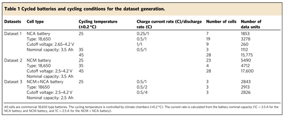 研究成果公开了三款不同材料体系商用锂离子动力电池长循环测试数据(如表1),包含130颗电池单体,每颗单体根据不同实验条件循环了50~1400次,实验条件包含了3个温度点(25℃、35℃、45℃),5个充放电倍率(0.25C、0.5C、1C、2C、4C)。