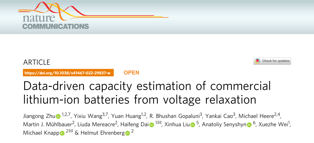 4月27日,《自然·通讯》(Nature Communications)在线发表了题为“Data-driven capacity estimation of commercial lithium-ion batteries from voltage relaxation”的研究论文。该研究由同济大学汽车学院魏学哲教授团队完成,团队朱建功副教授为论文第一作者,戴海峰教授为论文通讯作者。同济大学为论文第一完成单位,德国卡尔斯鲁厄理工学院为第二完成单位。这一研究成果提供了一种动力电池容量估计的新方法,为多种应用场景下的电源系统技术开发提供了新思路。