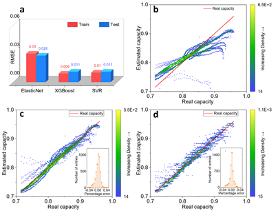 研究使用数据驱动的方法,提出了一种基于电池弛豫电压特征的容量估计方法。该方法从动力电池满充电后的弛豫电压信息中提取特征参数,实现电池容量估计误差(RMSE)为1.1%(图1)。通过构建迁移学习办法,提升估计方法的泛化能力和普适性。所构建的迁移学习办法在其他两款不同材料体系电池上进行了验证,验证得到的估计误差低于1.7%。