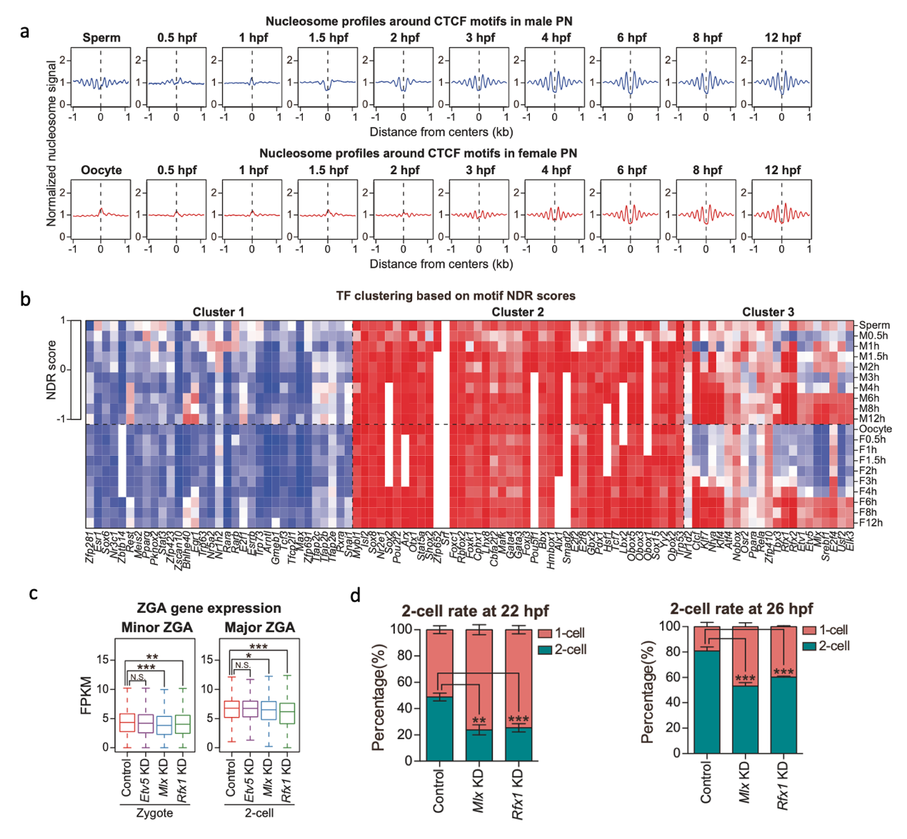 研究团队进一步探索了影响早期核小体排布的因素。分析发现,DNA序列中GC含量(鸟嘌呤和胞嘧啶比例)对于核小体占有率有显著影响,组蛋白上的乙酰化修饰,对于核小体NDR的形成可能具有调控作用。另外研究团队分析发现,一些转录因子会在受精过程中逐步取代核小体,结合在基因组的特定序列区域,并可能参与了更为广泛的启动子区域核小体NDR形成与特定基因转录激活。研究人员分别敲降了其中两个转录因子Mlx及Rfx1,发现Mlx可以调控合子时期ZGA的发生,而Rfx1可以显著影响2-细胞时期的ZGA。