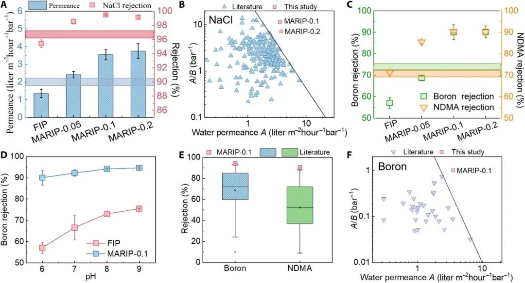研究发现,与对照组(FIP膜)相比,MARIP方法制备的RO膜的水渗透性显著提高,且膜对NaCl的截留率也同步提升,从95.4%(FIP)提升到99.5%(MARIP-0.1,纳米片引入量为0.1 wt%)。与文献报道的RO膜相比,MARIP-0.1膜具有极高的水/NaCl选择性能。同时,MARIP-0.1膜对硼和NDMA均具有很高的截留率(分别为90.1%和90.3%),并且具有很高的水/硼选择性,高于现有文献中报道的RO膜。