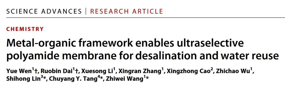我校环境科学与工程学院王志伟教授团队联合范德堡大学林士弘教授与香港大学汤初阳教授,针对水回用与海水淡化中典型小分子污染物——硼与二甲基亚硝胺(NDMA)传统反渗透(RO)膜去除率低的瓶颈问题,创新性地基于油水自由界面纳米片自组装传热传质同步调控,研制了一种新型超高选择性聚酰胺RO膜,实现了水中硼与NDMA的高效去除(>90%)。相关成果近日在Science子刊Science Advances在线发表,题为“Metal Organic Framework Enabled Ultra-Selective Polyamide Membrane for Desalination and Water Reuse”。