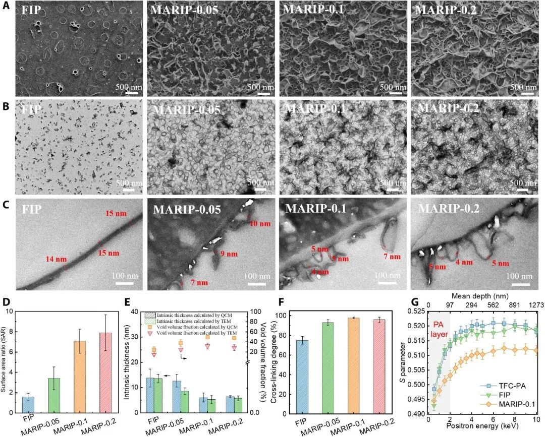 对膜进行结构表征,发现当无纳米片调控自由界面聚合反应时,所形成的FIP膜表面较为平整(聚酰胺层固有厚度~16 nm)。随着纳米片引入水/油界面调控聚酰胺形成过程,膜表面出现了典型的“峰谷”结构,特别是对于MARIP-0.1和MARIP-0.2膜而言,大片叶状结构占据了大部分膜表面。同时发现,随着纳米片的引入,聚酰胺层固有厚度降低至~5 nm,膜的比表面积和空腔占比显著提升,膜的交联度也显著提高。