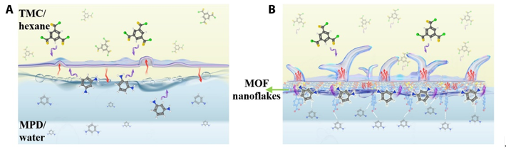 RO膜分离是海水淡化、污/废水深度处理以及水回用中的重要技术。然而,尽管现有商业聚酰胺RO膜对水中盐的截留率大部分能达到99.0%以上,其对一些高毒性小分子污染物(如海水中的硼、消毒副产物NDMA等)的去除效果仍然有限。该研究通过将两亲性CuBDC金属有机框架纳米片原位引入水/正己烷的自由界面,提出了基于纳米片自组装精准调控的界面聚合反应(MARIP)方法,制备了具有超高选择性的聚酰胺RO膜,极大程度地提高了RO膜对高毒性小分子污染物硼与NDMA的去除率。