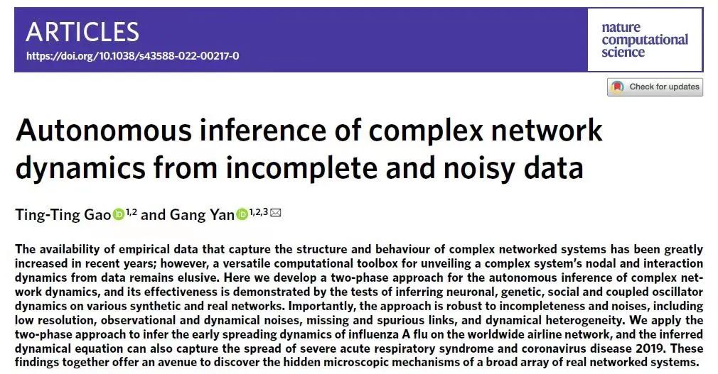 北京时间3月25日凌晨,《自然·计算科学》(Nature Computational Science)在线发表了题为“Autonomous inference of complex network dynamics from incomplete and noisy data”的研究论文,该研究由同济大学物理科学与工程学院、上海自主智能无人系统科学中心严钢教授团队完成。在该研究中,作者提出了数据驱动的复杂系统自主推理新框架,实现了结构信息不完整和强噪声场景下的鲁棒推理,为自动化、智能化地发现真实复杂系统的底层原理提供了重要基础和算法支撑。特别值得一提的是,这一算法能有效验证SARS和COVID-19的早期传播行为。