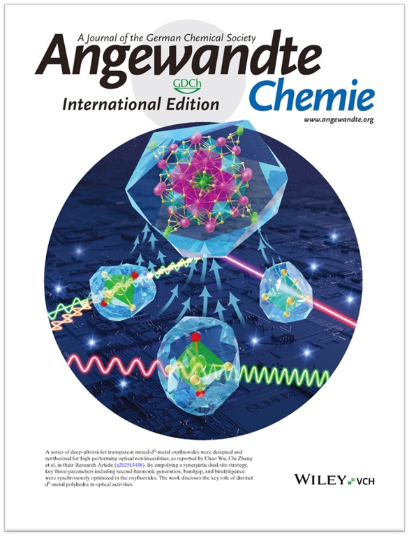 近日,欧洲科学院院士、德国国家工程院院士、同济大学化学科学与工程学院张弛教授研究团队在混合d0过渡金属二阶非线性光学晶体材料研究中再获重要进展,实现了二阶非线性光学晶体材料深紫外透明度/非线性光学性能权衡的新突破。同济大学化学科学与工程学院研究团队与中科院北京理化技术研究所和澳大利亚国立大学等单位研究团队紧密合作,利用第一性原理计算对过渡金属氟化基元进行筛选,采用协同双位点策略,合成了首例深紫外透过且能够通过四次谐波产生输出266 nm倍频光的混合d0过渡金属材料A5(NbOF4)(TaF7)2 (A = K, Rb, Cs, NH4),探讨并阐明了受控氟化基元对晶体材料光学性能的调控机制。相关研究成果以“Breaking the Deep-UV Transparency/Optical Nonlinearity Trade-Off: Three-Parameter Optimization in Oxyfluorides by Tailoring d0-Metal Incorporation” (打破深紫外透明度/非线性光学的权衡:通过调控d0金属掺入优化氧氟化物的三个参数)为题,日前以全文(Research Article)形式发表于国际化学、材料顶级权威学术期刊《德国应用化学》(Angewandte Chemie International Edition),并被编辑委员会遴选推荐为当期的封面文章(Inside Front Cover)和热点论文(HOT Paper)。