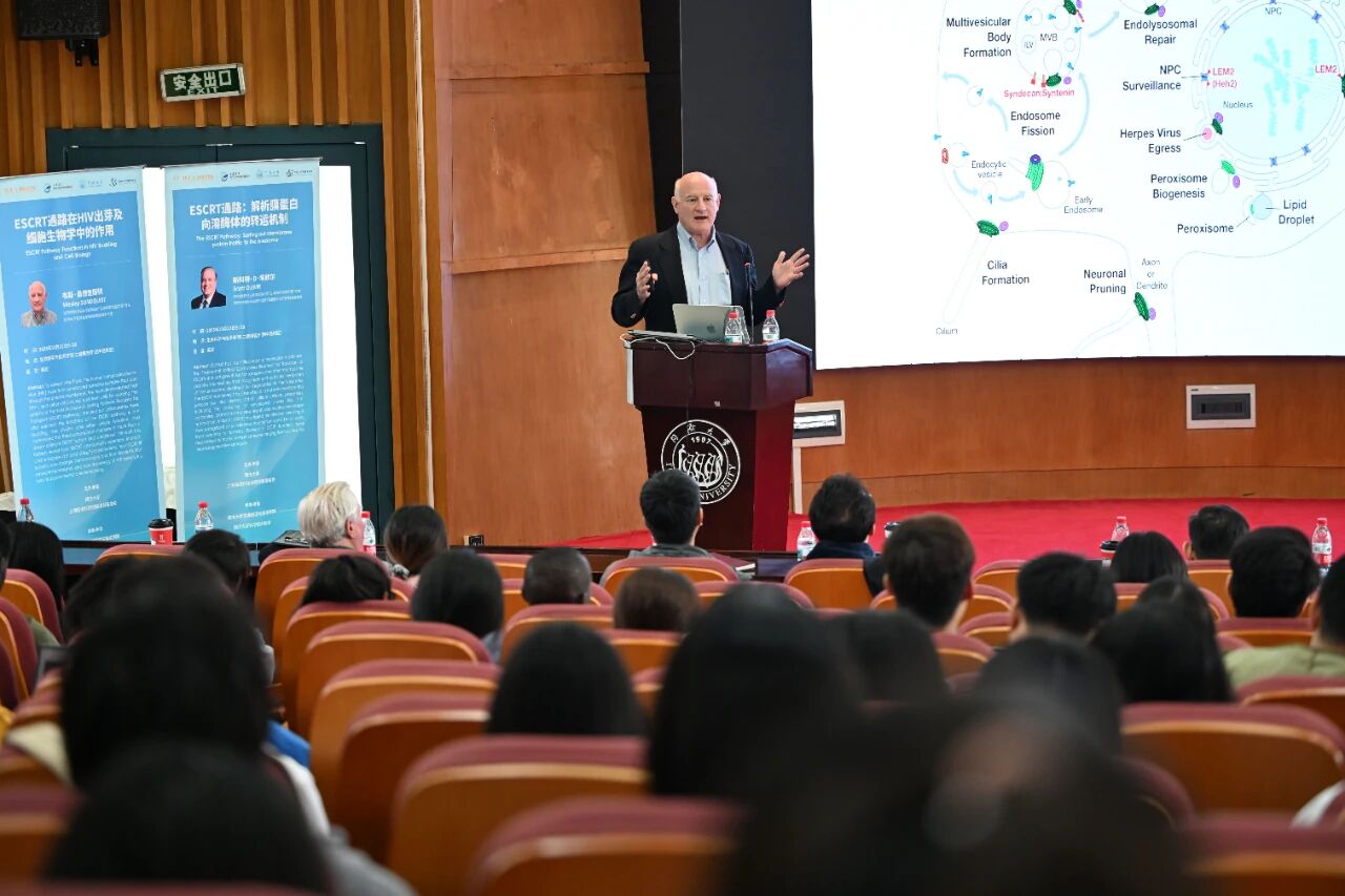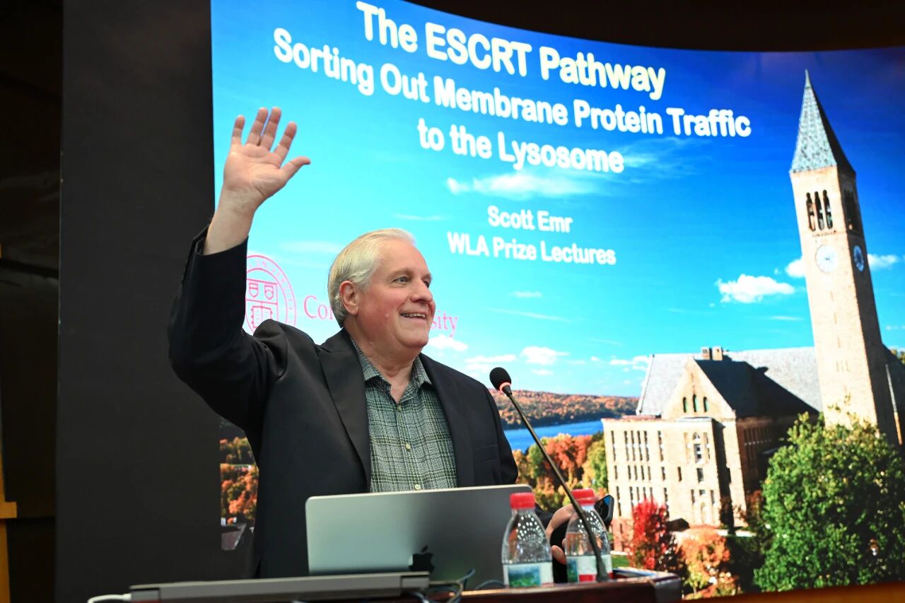 在题为《ESCRT通路:解析膜蛋白向溶酶体的转运机制》的报告中,埃默尔教授回顾了其团队发现ESCRT通路的科学历程。通过在酵母中筛选突变体,他的实验室首次鉴定出一系列参与蛋白质分选的VPS基因,并揭示了ESCRT-0至ESCRT-III复合物及ATP酶VPS4协同驱动膜重塑的分子机制。该系统能将膜蛋白准确“护送”至溶酶体降解,对理解细胞分裂、受体调控、病毒出芽等过程具有里程碑意义。埃默尔教授还指出,ESCRT功能异常与癌症、神经退行性疾病等密切相关,为疾病机理研究提供了重要线索。
