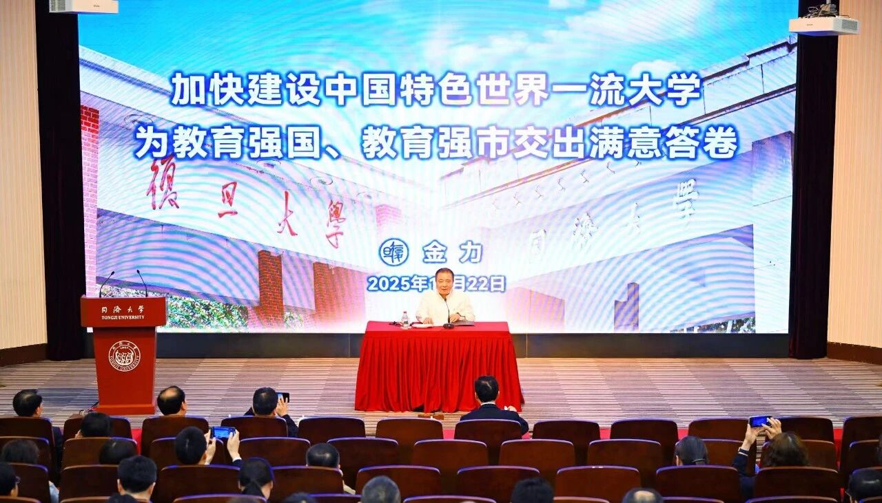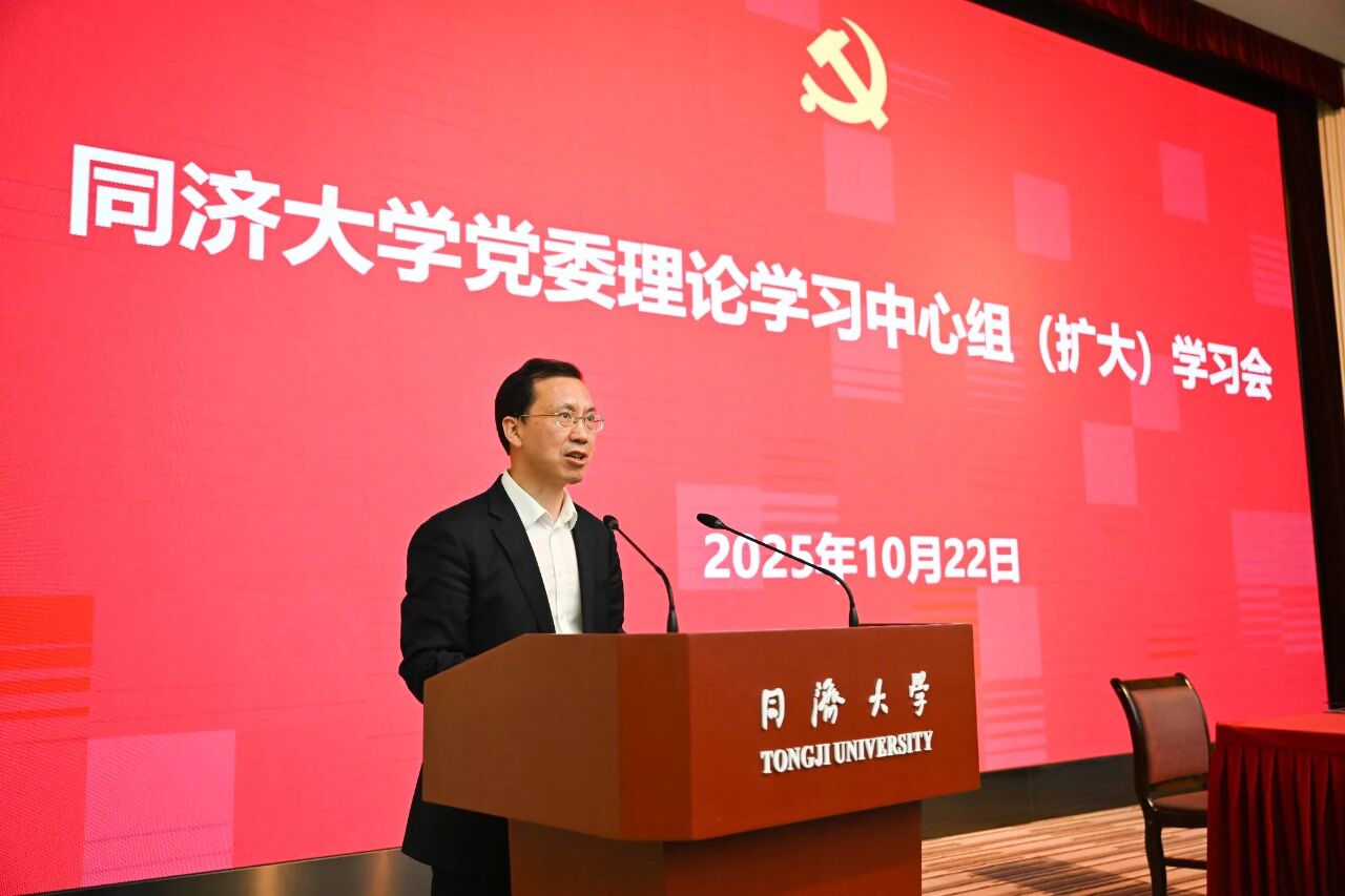 10月22日下午,同济大学召开党委理论学习中心组(扩大)学习会,邀请复旦大学校长、中国科学院院士金力作专题辅导报告,分享对教育强国背景下大学使命的思考和复旦大学的改革实践探索。校党委书记、中国工程院院士郑庆华主持学习会。