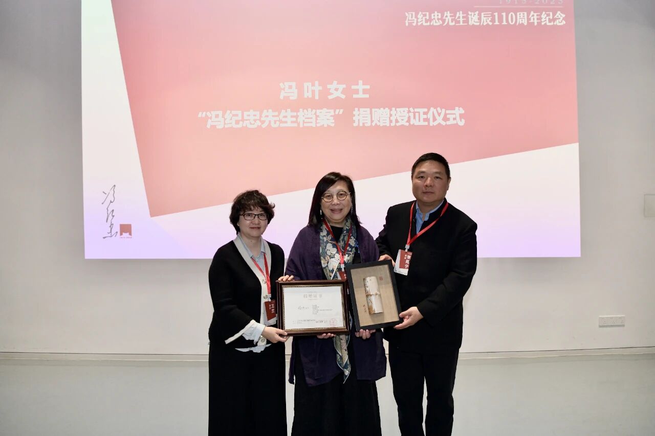 纪念活动上,冯纪忠先生之女冯叶女士向学院捐赠了一批极为珍贵的冯先生学术档案,包括其工作笔记、读书札记、手稿、设计草图、访谈录音录像以及松江方塔园等工程图纸扫描件等。这批资料将公开用于对先生思想和作品的研究,以及学院的教学和展览等。