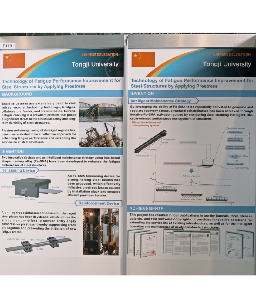 顾祥林教授、余倩倩教授团队针对钢结构疲劳性能有效提升的技术挑战,研发了基于高性能新材料的钢结构疲劳性能预应力提升体系,可有效施加预应力,实现少干扰、可恢复的性能提升,并在结构全寿命服役过程中实现对预应力的精准调控,为钢结构重要基础设施性能演化与控制提供技术保障。
