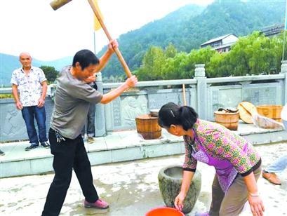 去年中秋,村民们在丰禾安桥上打糍粑