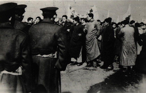 1948年1月29日,国民党反动军警将枪口对准手无寸铁的学生。