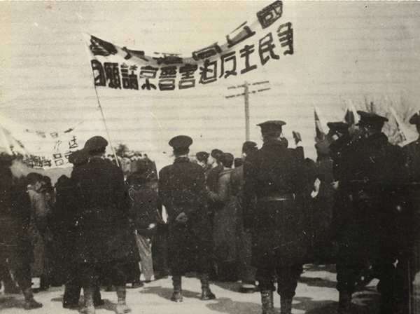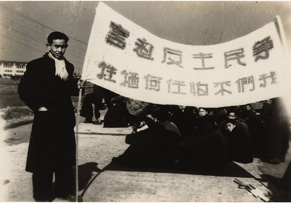 1948年“一·二九”事件时,同济大学游行的学生所高举的标语横幅。