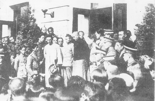 蒋介石被迫出见学生。(图中穿长袍马褂者为蒋介石)