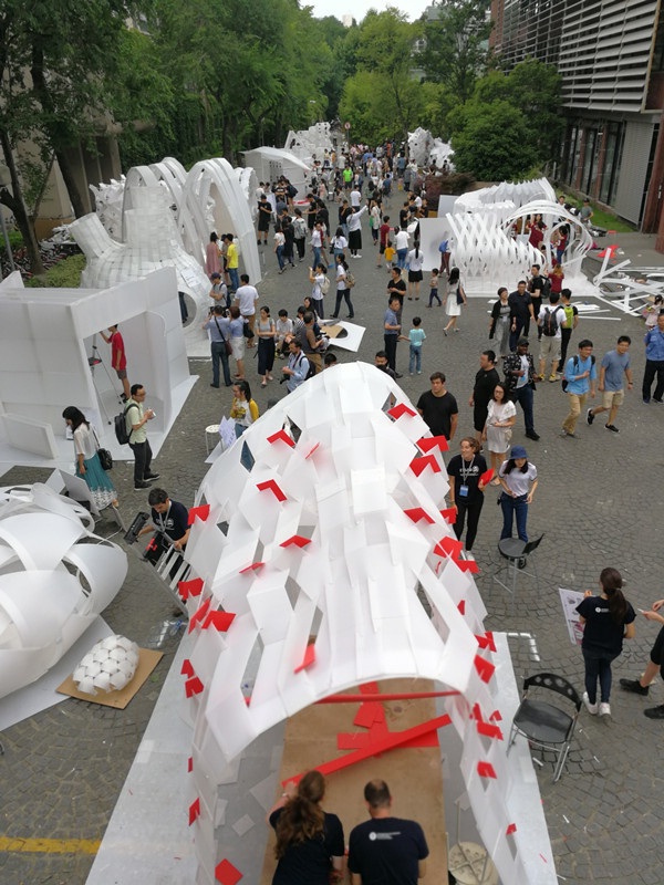 当日傍晚,经过8小时现场连续作业,35栋形态不一的白色塑料中空板建筑,在一支支中外大学生团队手中渐渐成形,成排耸立于学院广场,均衡分立于广场两侧,在当中自然形成一条“临时学生街”,蔚为壮观。