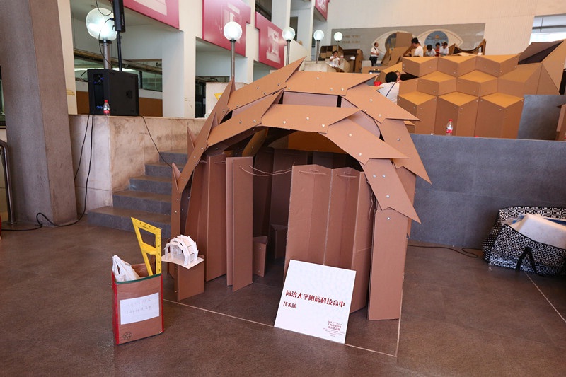 值得注意的是,今年建造节的赛场上还出现了一批高中生的身影——“同济大学2018上海市中学生建造邀请赛”由同济大学本科生院(招生办公室)主办,吸引到上海中学、复旦附中、华师二附中、上海交大附中、同济一附中、同济附属科技高中等沪上15所高中学生前来参赛,每队使用黄色瓦楞纸板,在6小时内建造一栋震后简易的单人临时庇护所,以纪念汶川地震十周年。