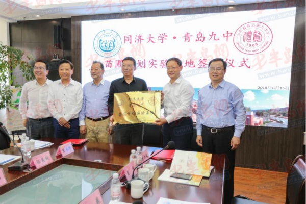 参观结束后,同济大学青岛九中苗圃基地”协议签约仪式在行政楼409会议室隆重举行。这标志着同济大学“苗圃计划”正式落户青岛九中,青岛九中成为山东省第一所同济大学“苗圃计划”基地学校。仪式首先由青岛九中校长马志平代表东道主发表致辞,他对各位领导的莅临表示了热烈的欢迎,早在83年前的礼贤中学就已和同济大学签订了教育协议,今天的青岛九中与同济大学“苗圃基地”的签约是更是一件振奋人心的大事,同济与青岛与礼贤的这份渊源必将更好的促使双方实现互惠互利、共同发展的双赢格局。青岛九中也将以此为契机,为同济大学输送更多“德才兼备、知行合一”的高素质人才。随后,青岛九中校长马志平和同济大学本科生院院长黄一如代表两校进行了正式签约,并为“苗圃计划”人才培养基地揭牌。