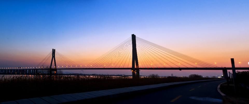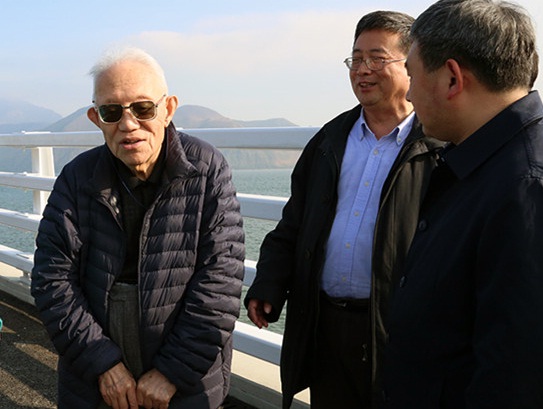 ▲图为中国科学院院士、同济大学孙钧教授(左1)和其学生、同济大学教授徐伟(左2)在大桥上的合影。
