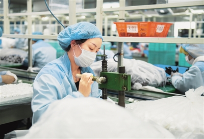 全国各地多措并举助力复工复产。图为浙江省余姚市一家日用品公司的工人们在生产线上紧张作业