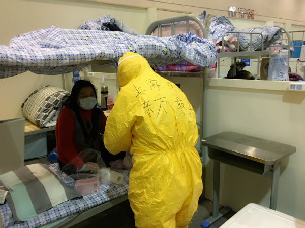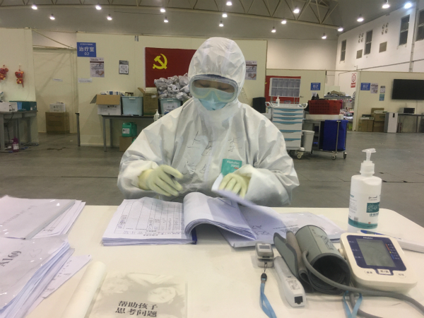 图说:李昕在武汉客厅方舱医院里工作