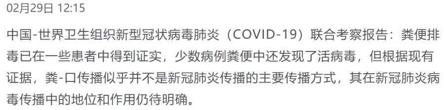2月29日发布的《中国-世界卫生组织新型冠状病毒肺炎(COVID-19)联合考察报告》原文中也有这样表述:
