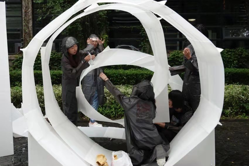 如何用建筑体现亲密与疏离之间的关系?今天(6月19日),在同济大学四平路校区内,学生们身披雨衣,用塑料中空板搭建出多座超炫房子,引得师生驻足观看。