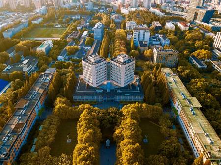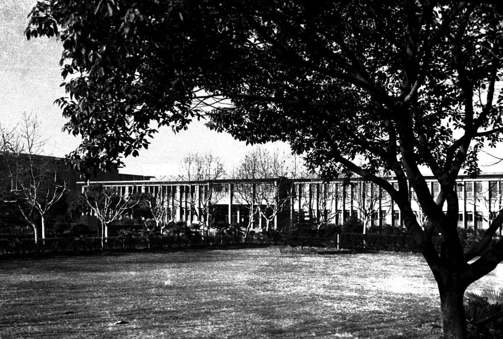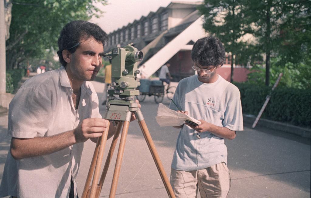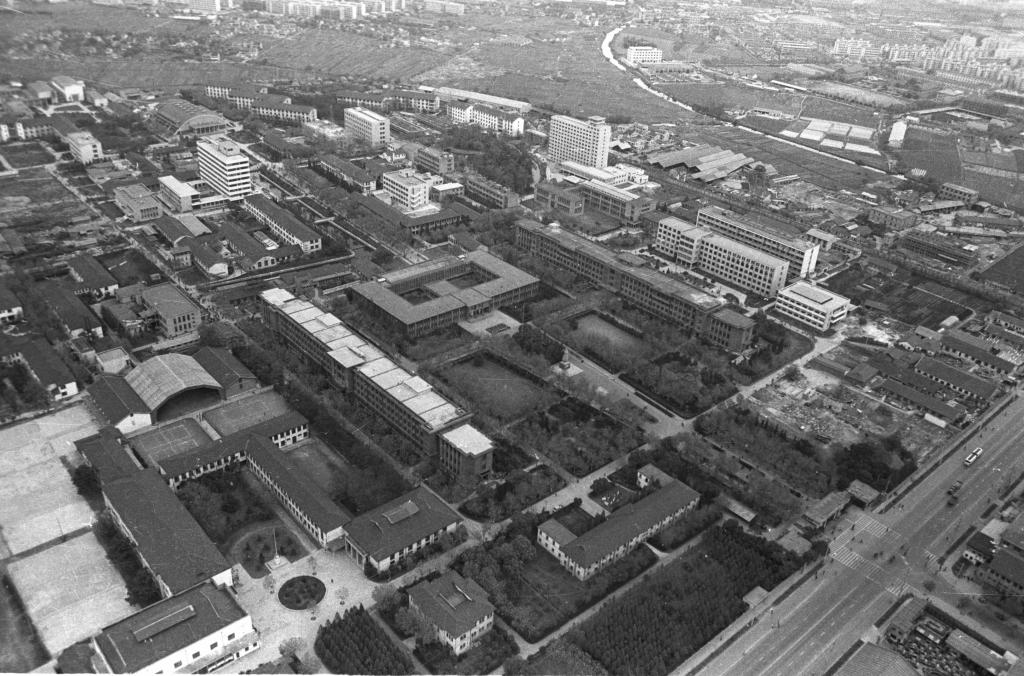 这张1984年同济大学四平路校区的航拍图得之不易。为当时招生宣传需要,起初,工作人员在楼顶用毛竹搭建高台进行拍摄,但摄影师刚到达1/3处,毛竹架就被大风吹得东倒西歪,未能拍摄出完美的全景照。后来,经学校多方协调,有幸得到空军支援。学校派张少元、姜锡祥老师乘坐一架小型螺旋桨飞机,在简单的保护措施下,低空飞行进行拍摄,终于留下了当年同济园的珍贵影像。