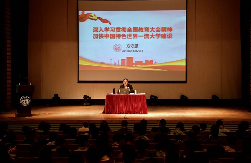 校党委书记方守恩在四平路校区“一·二九”礼堂,以“深入学习贯彻全国教育大会精神,加快中国特色世界一流大学建设”为题,为土木工程学院、人文学院2017级的本科生共550余人授课。方守恩主要从充分认识全国教育大会的重大意义、深入学习领会习近平总书记的重要论述、扎实推进加快教育现代化的重点任务、全力确保教育大会精神落地落实等四个方面,全面传达全国教育大会精神。方守恩为在座同学们解读当前和今后一段时期教育工作的总部署、总方略,并深入学习习近平总书记提出的“九个坚持”的重要论述,分析了其中所体现的鲜明的政治性、高度的战略性、强烈的人民性、深刻的规律性、提出的创新性。
