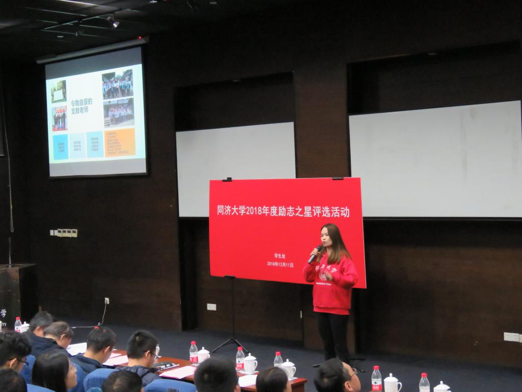 20名候选人分成学业标兵、创新创业、公益服务、自强不息四个组别依次参加答辩。他们有的矢志科研,学业精进;有的参军入伍、爱国奉献;有的服务“一带一路”战略、创新创业;有的致力于支教服务,传播公益力量;有的自立自强,激荡生命力量。他们分享的故事,有奋进、有温馨、有感动,激励着在场所有的师生。他们以自己的光芒照亮了他人,从不同层面凸显了励志精神的时代感,展现了“励志”更为丰富的内涵。最终,来自交通运输工程学院的方意心、高华,汽车学院的谷鹏,法学院的加依娜•扎瓦提别克,机械与能源工程学院的李国文,人文学院的麦尔哈巴•阿布都热西提、张晓萌,医学院的佘云浪、王新安,化学科学与工程学院的姚孟婷等10位同学获得“同济大学2018年度励志之星”荣誉称号。曹翠翠、陈爔、程鑫、啜世阳、范皓翔、林静、马阳平、毛欣越、宋增春、杨正军等10位同学获得“励志之星提名奖”。