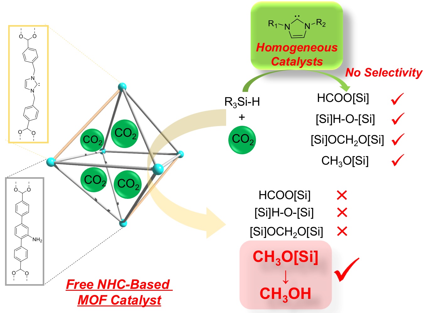 近期,费泓涵教授课题组设计通过配体交换的方法原位生成卡宾并修饰到高稳定锆基MOF中,构建了一例无过渡金属配位的NHC功能化MOF,在温和条件下催化还原CO2。该方法巧妙地利用了配体交换过程中无机碱溶解羧酸配体的过程,将该步骤中原位活化的卡宾配体通过固液两相的动态平衡逐步修饰到MOF骨架,从而避免了传统卡宾生成需强碱(如NaH,KOt-Bu)处理而导致晶态结构坍塌的问题。相较于均相卡宾催化剂,这例MOF在CO2的硅氢化反应中呈现出更高的催化活性,其孔道尺寸效应使卡宾位点更易活化硅烷底物,实现定量转化(>99%)。更重要的是,在多个产物中,只有化学附加值最高的甲氧基取代还原产物(CH3O[Si])可在MOF孔道中自由扩散,催化选择性优异(>99%),且能定量水解为甲醇(CH3OH),最终实现在常温常压下从CO2到CH3OH的高效催化循环,TON和TOF均远高于已报道的均相卡宾催化剂。