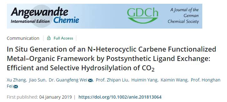 CO2虽然是主要的温室气体,但在绿色有机化学领域是廉价无毒的C1原料。目前的CO2催化转化体系在同时提高活性和选择性方面仍存在重大挑战,以金属有机框架(MOF)为代表的晶态多孔结构为催化转化CO2提供了新思路,有望通过晶格矩阵的精确控制实现高活性和高选择性。我校化学科学与工程学院费泓涵教授课题组长期致力于功能化MOF材料的研究,关于功能化MOF材料催化还原CO2的研究成果以“In Situ Generation of an N-Heterocyclic Carbene Functionalized Metal–Organic Framework by Postsynthetic Ligand Exchange: Efficient and Selective Hydrosilylation of CO2”为题发表于国际顶级化学期刊Angew. Chem. Int. Ed.最新一期(DOI: 10.1002/anie.201813064)上。