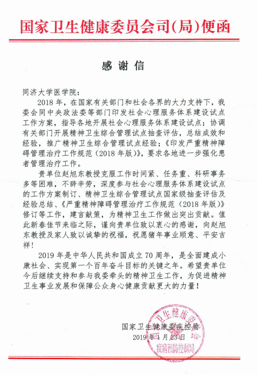 近日,我校医学院收到了一封来自国家卫生健康委疾控局的感谢信。信中提到:同济大学赵旭东教授克服工作时间紧、任务重、科研事物多等困难,不辞辛劳,深度参与社会心理服务体系建设试点的工作方案制订、精神卫生综合管理试点国家级抽查评估及经验总结、《严重精神障碍管理治疗工作规范(2018年版)》修订等工作,建言献策,为精神卫生工作作出突出贡献。全文如下: