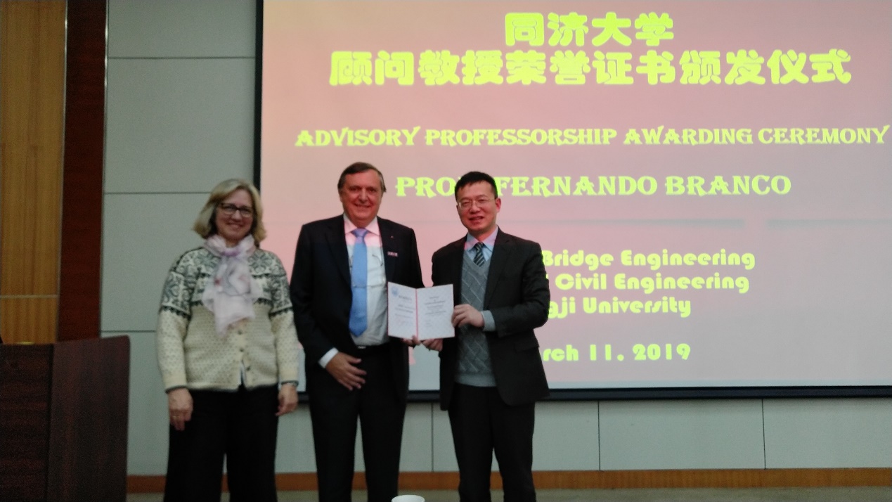 3月11日,同济大学聘任国际桥协现任主席Fernando Branco教授为顾问教授的受聘仪式在桥梁馆一楼报告厅举行。同济大学党委副书记、纪委书记方平为Fernando Branco颁发证书,佩戴同济大学校徽,对Fernando Branco的加盟表示热烈欢迎。