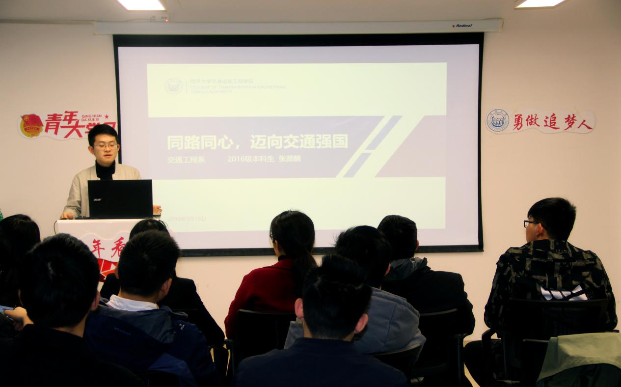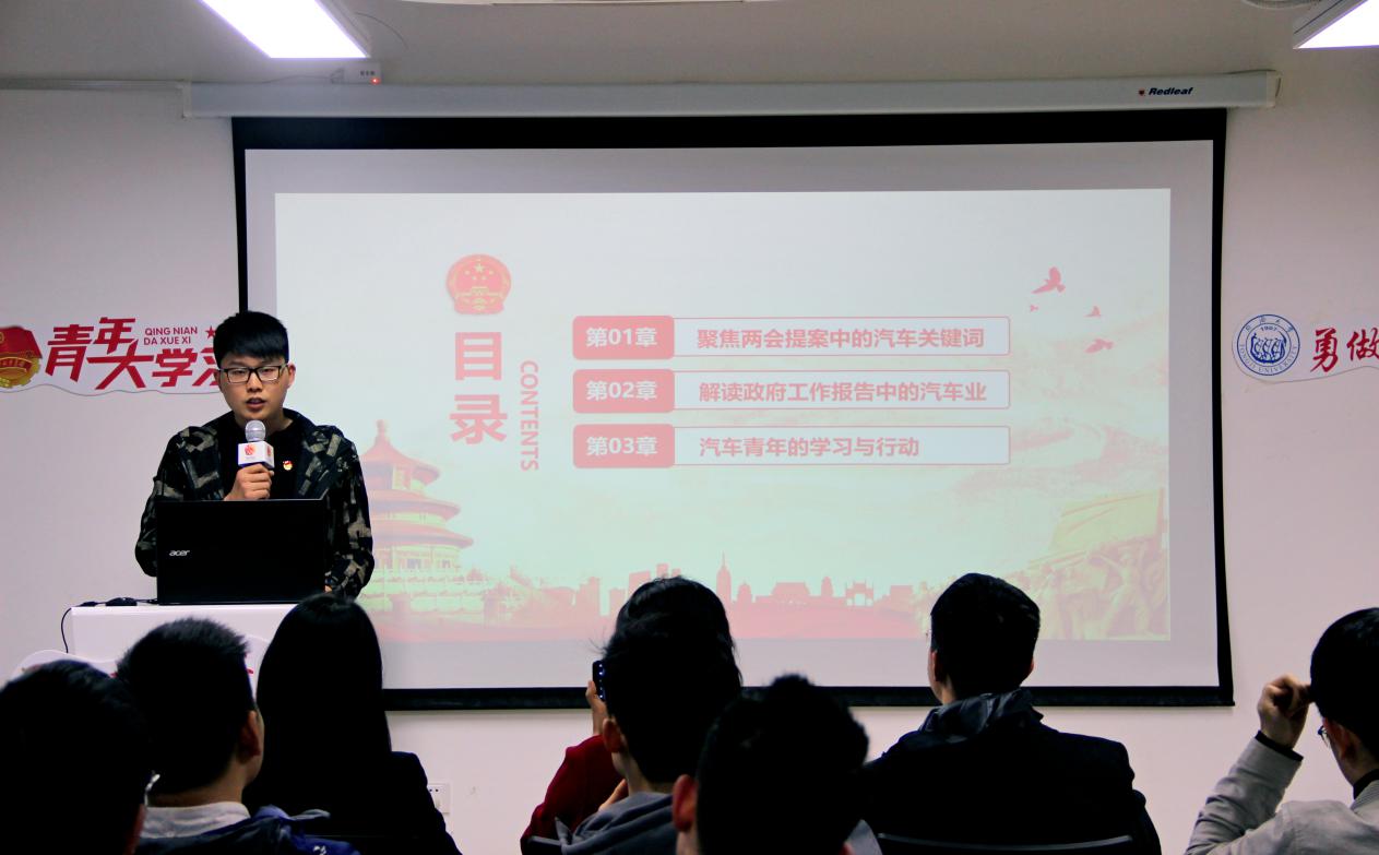 活动现场,时代声音传播社负责人苏杰简要介绍了社团成立以来开展的“送团课进支部”“寻找马克思”“我和祖国有个约会”“红色大寻访”等同济青年学、青年说、青年行系列活动,并带领在座同学共同回顾了今年政府工作报告中的要点和习近平总书记的两会“金句”。