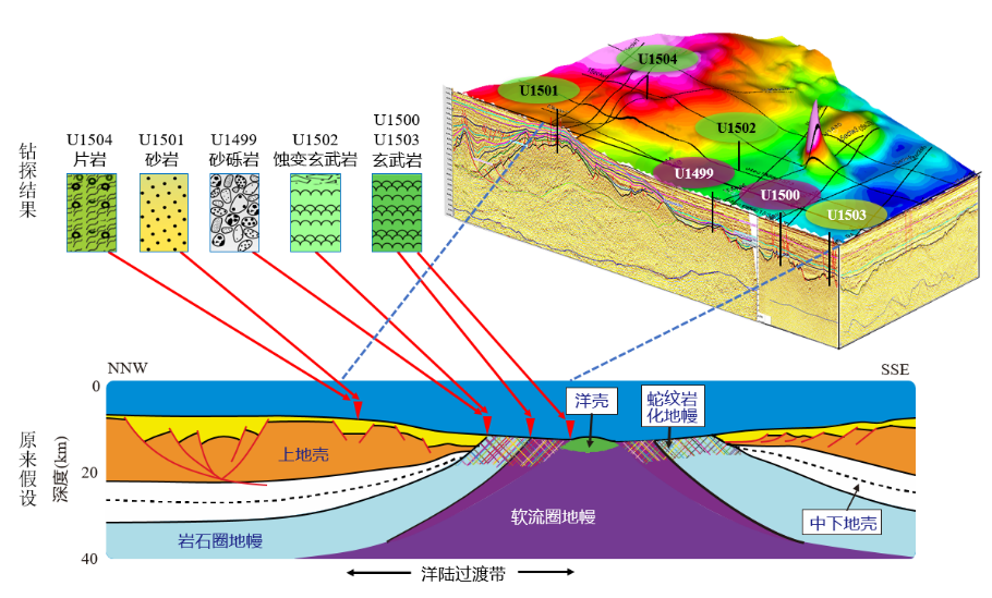 (南海大洋钻探结果否定了原有假设:洋陆过渡带基底并非蛇纹岩化地幔。下方为按照大西洋模式的剖面解释示意图,左上方示钻探揭示的基底岩性)