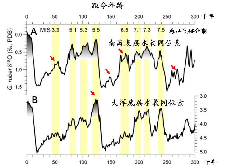 (最近30万年的两类海洋氧同位素曲线。A. 南海表层水; B. 大洋底层水。红色箭头提示两者的显著差异。)