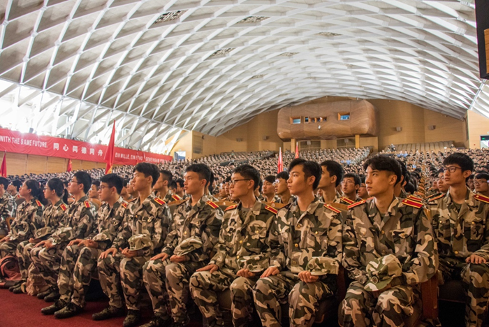 此次集中军训动员大会在激越的军歌声中圆满结束。整场大会,全体参训学生坐姿端正挺拔,会场氛围严肃庄重,为军训打下了良好的开端。