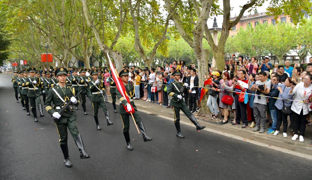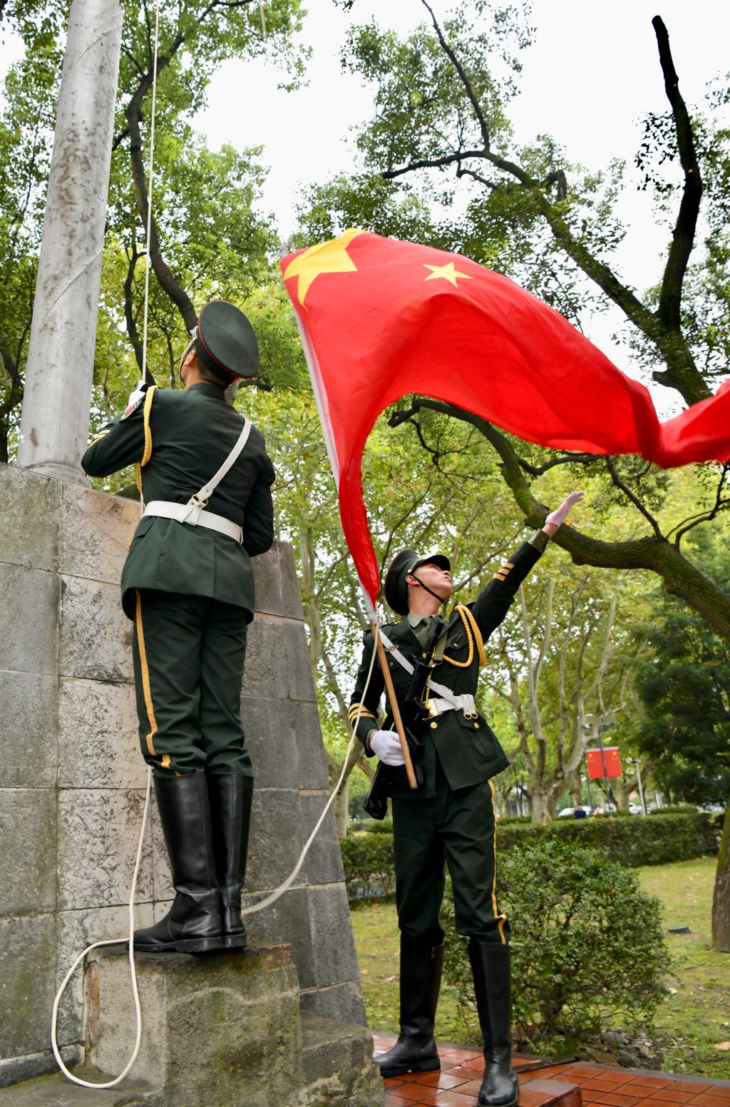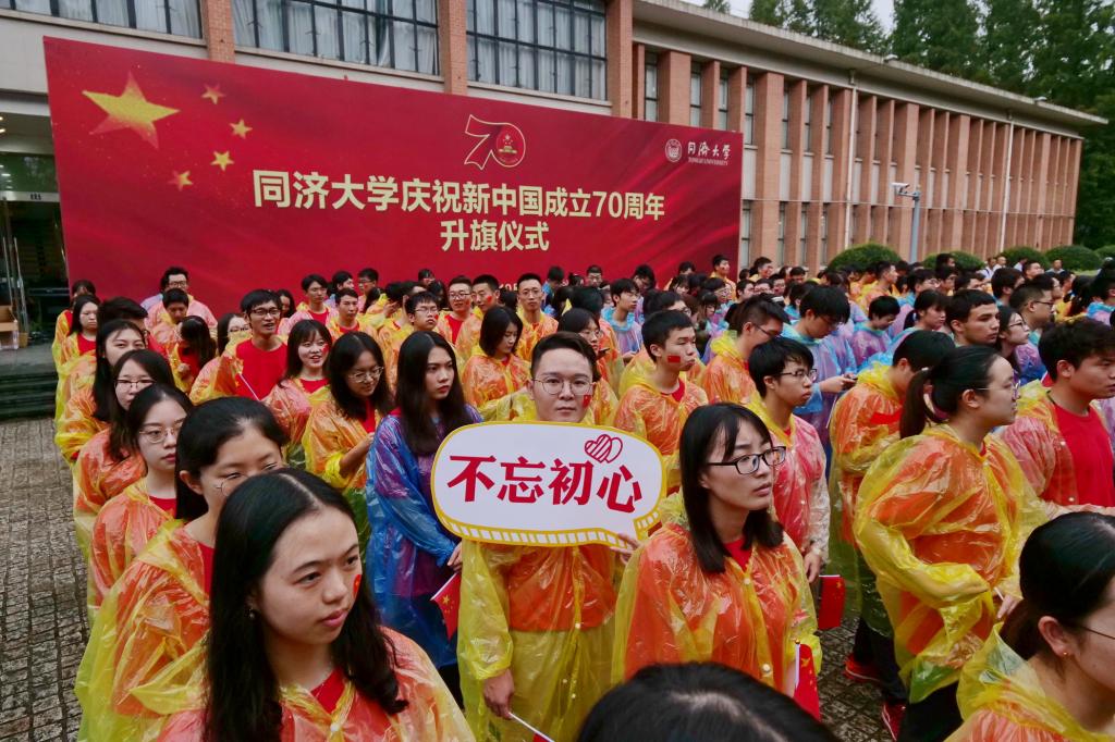 同济大学国旗班同学身着戎装、雄姿英发,他们迈着矫健的步伐,走向升旗台。在雄壮的国歌声中,鲜艳的五星红旗冉冉升起。在场师生神情庄严肃穆,他们齐声高唱着国歌,向着国旗行注目礼。炽热的爱国情怀在每一位同济人心中澎湃、激荡。