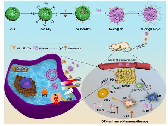 为此,我校石硕教授和董春燕教授课题组开展跨学科合作研究,积极尝试通过化疗联合免疫治疗TNBC。研究人员将介孔硫化铜(CuS)作为药物载体负载低剂量的多西他赛,发挥其良好的光热转换效率提供光热治疗。利用肿瘤主动靶向受体叶酸(FA),使纳米粒有效地靶向定位肿瘤病灶。同时,为了提高纳米粒的水溶性和实现CpG的负载,研究人员利用聚乙烯亚胺-原卟啉 IX(PEI-PpIX)包覆于CuS表面,有助于CpG吸附于纳米粒表面并实现光动力治疗,最终构建了FA-CuS/DTX@PEI-PpIX-CpG (FA-CD@PP-CpG)多功能纳米抗肿瘤药物复合体。FA-CD@PP-CpG通过静脉注射后可靶向定位到肿瘤部位,负载的DTX和CpG释放出来,DTX促进MDSCs中的M2亚型向M1亚型转化并分泌出IL-12、TNF-α因子,而CpG则识别抗原提呈细胞,促使Th1细胞产生IL-12、TNF-α,增多的IL-12可以促使T细胞浸润至肿瘤部位,并激活形成CTLs激活的CTLs可以分泌IFN-γ杀死肿瘤细胞,在T细胞浸润至肿瘤部位后通过皮下注射PD-L1抗体(aPD-L1)进一步增强免疫治疗的效果从而达到全身治疗的目的。这是一个具备光热和光动力治疗功能的化疗协同免疫治疗,局部治疗结合全身治疗的新策略。