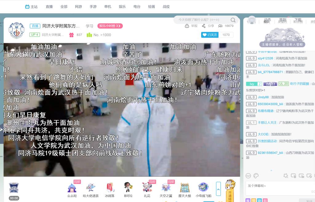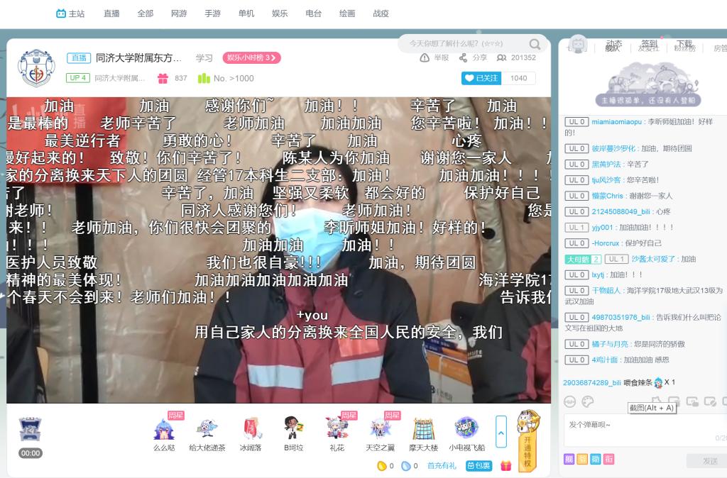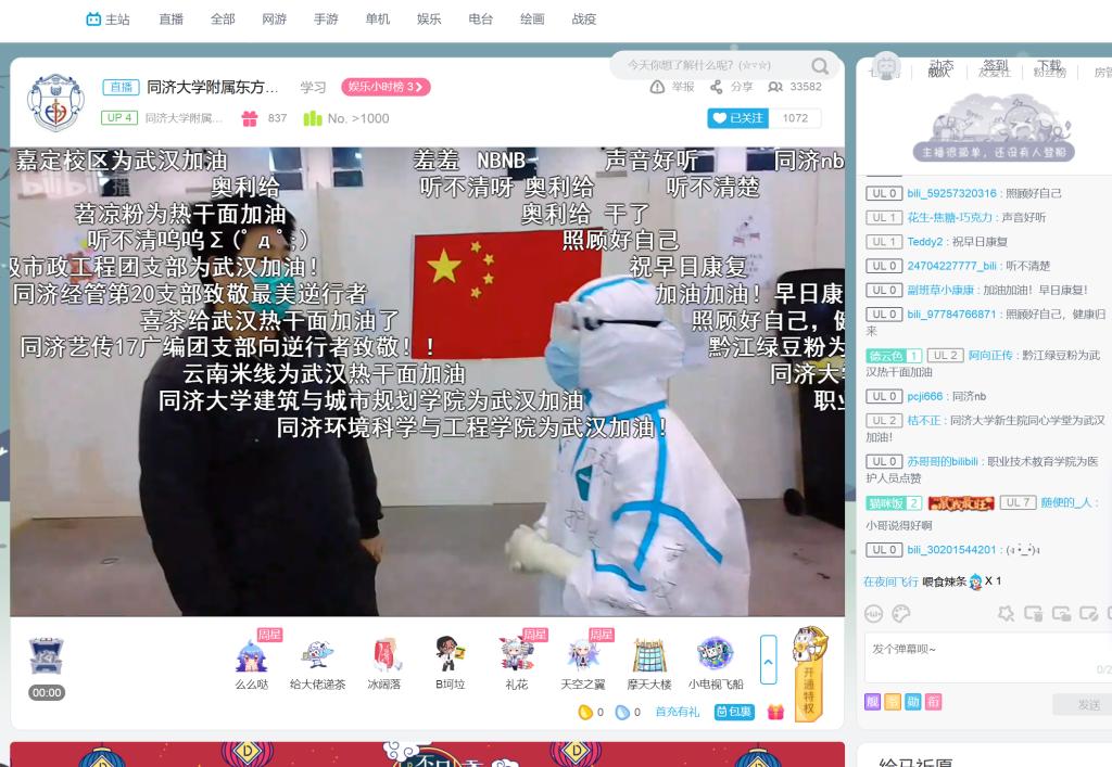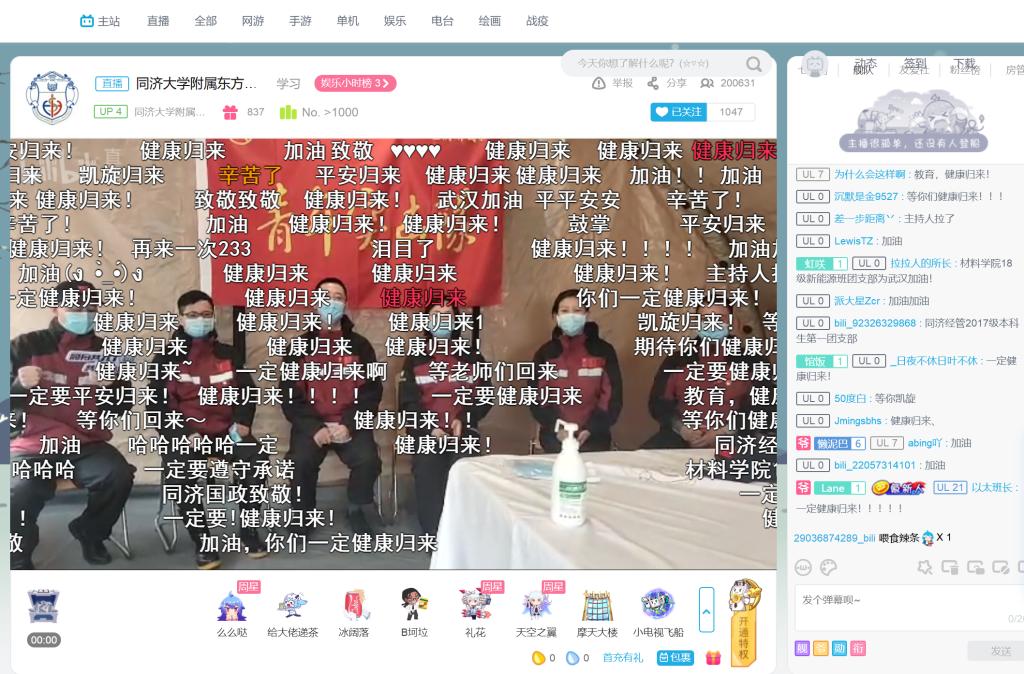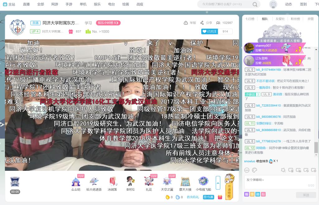 “向最美逆行者致敬!”“同舟共济,共克时艰!”“请你们照顾好自己,期待你们健康归来!”……2月25日下午3时,以“凝聚青春正能量,众志成城抗疫情”为主题的同济大学特别主题团课在武汉客厅方舱医院开讲,主讲人是正奋战在方舱医院医疗救治一线的同济大学附属东方医院国家紧急医学救援队暨中国国际应急医疗队(上海)队员们。同济大学等沪上高校约20万青年学子通过bilibili视频网站在线听课,并与前方医疗队员们互动,送上由衷的敬意与温暖的祝福。在直播正式开始前,一条条温暖的弹幕就一次次刷屏。一个小时内,累计弹幕3万余条。这也是上海学校共青团“战疫”系列主题团课的第一期。