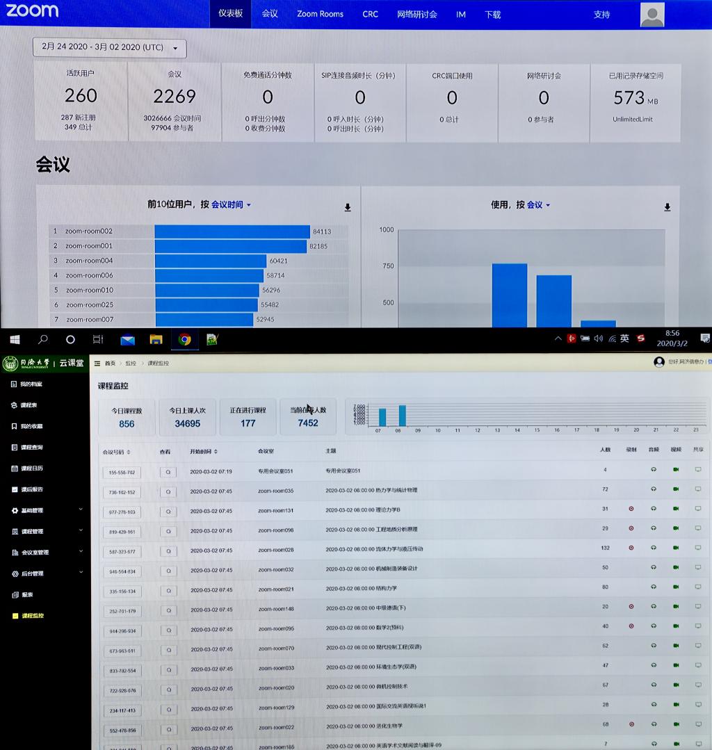 上午9时许,信息化办公室监控屏幕显示:正在进行的课程为177门,在线人数7452人;当天全天将有856门课程开展在线授课,上课人次累计将达34695人。方守恩、陈杰一行在监控屏幕前观看了几位老师的在线教学场景,就学生签到、教师板书、师生互动、课程视频录制等在线教学的一些具体细节进行询问、了解。