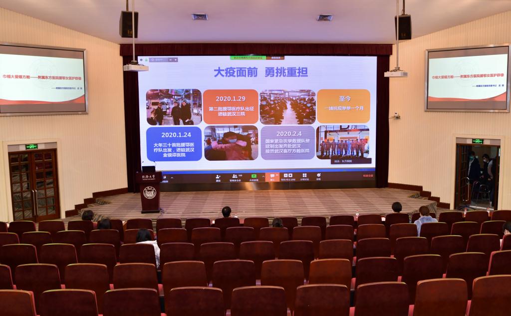校医院总支书记毕婉蓉以“校园抗疫急先锋——校医院‘巾帼号’”为题,介绍了自疫情发生以来,校医院女医护人员奋战在校园防控一线,切实履行维护校园公共卫生安全职责的事迹。